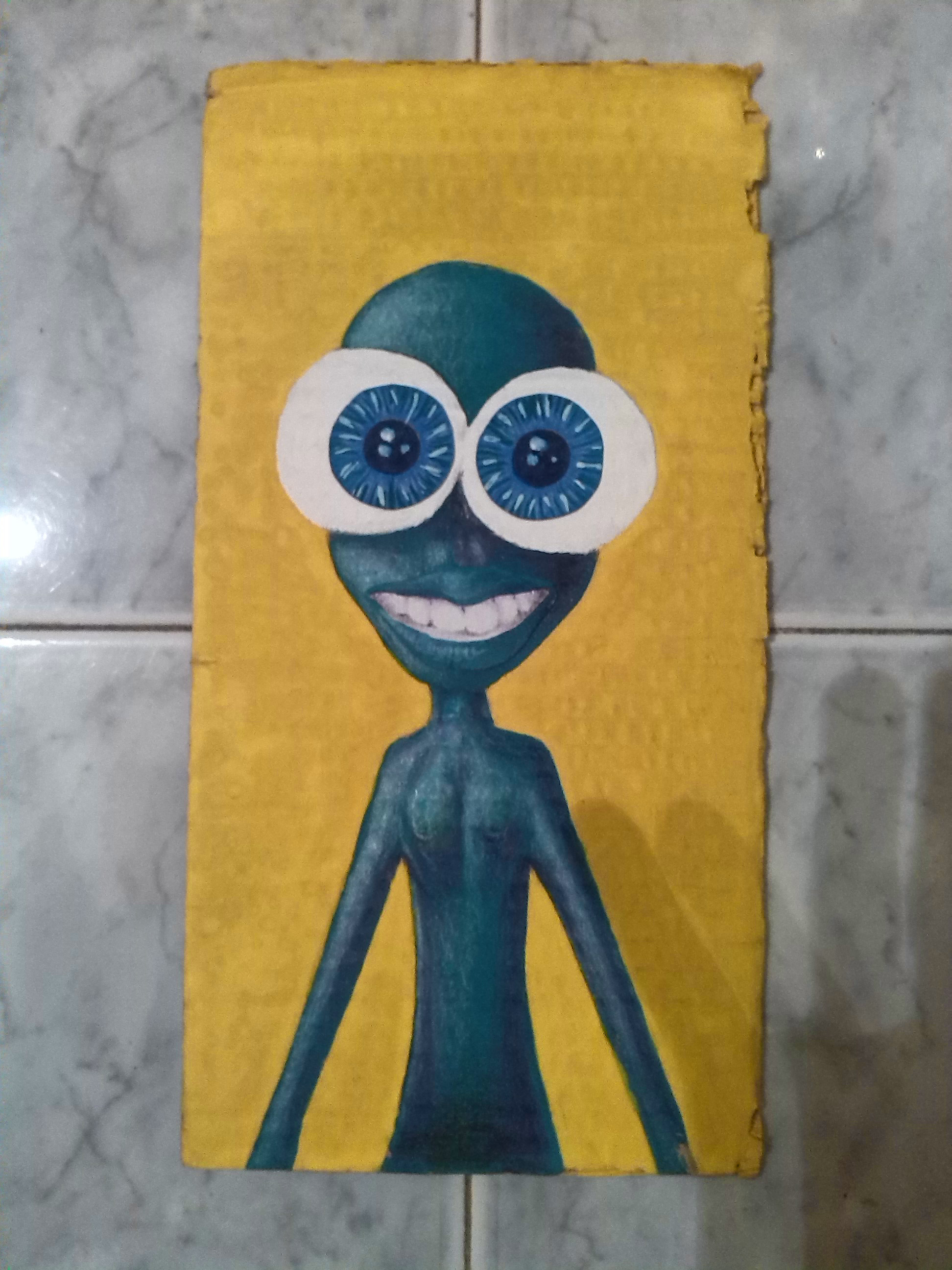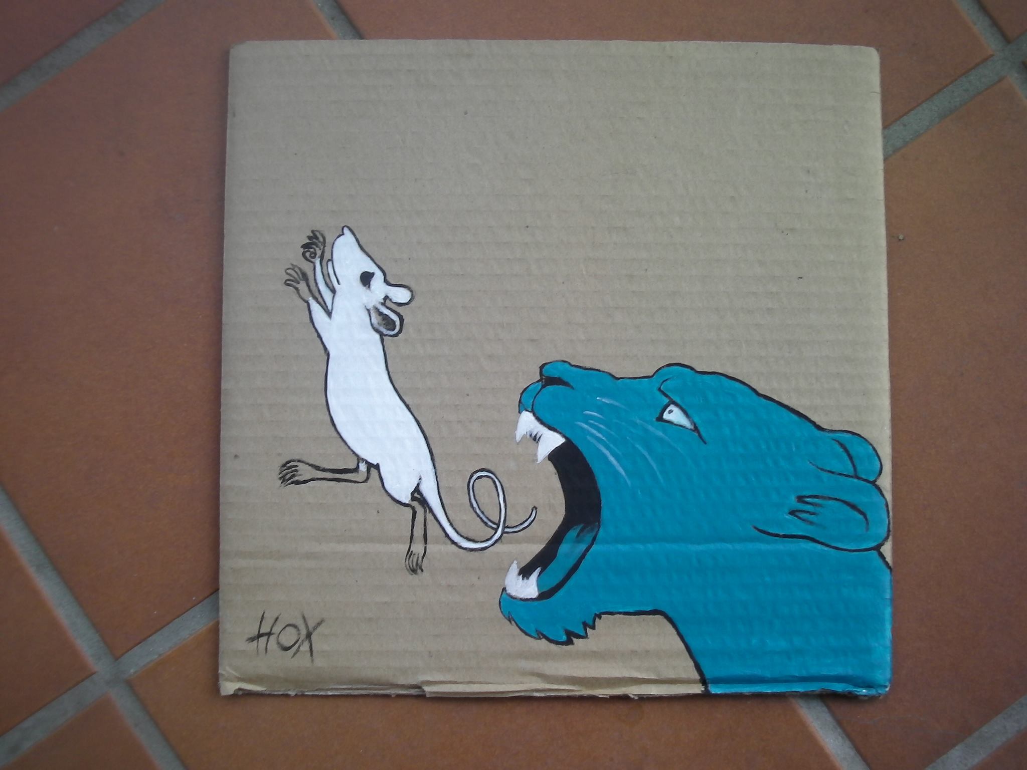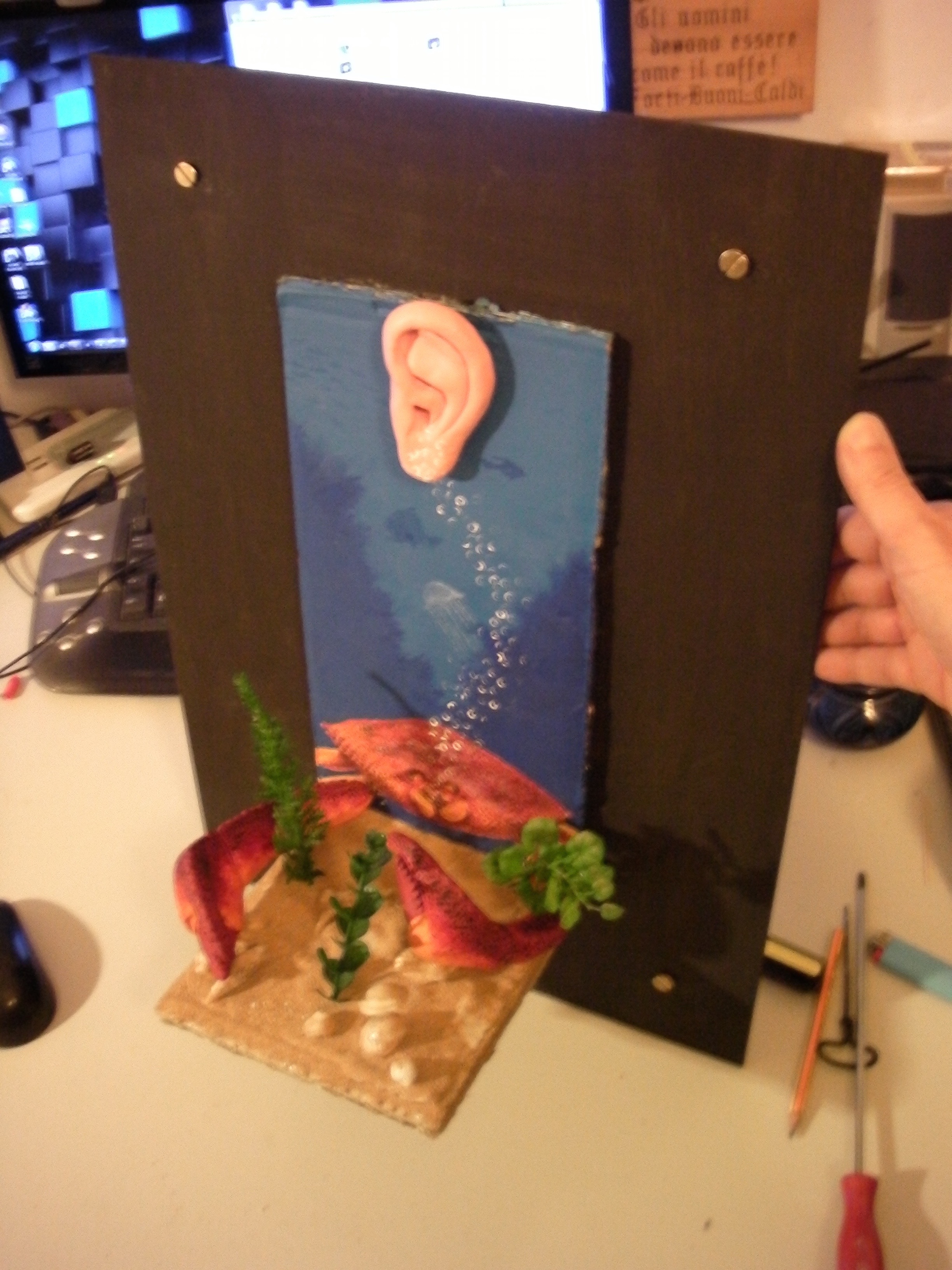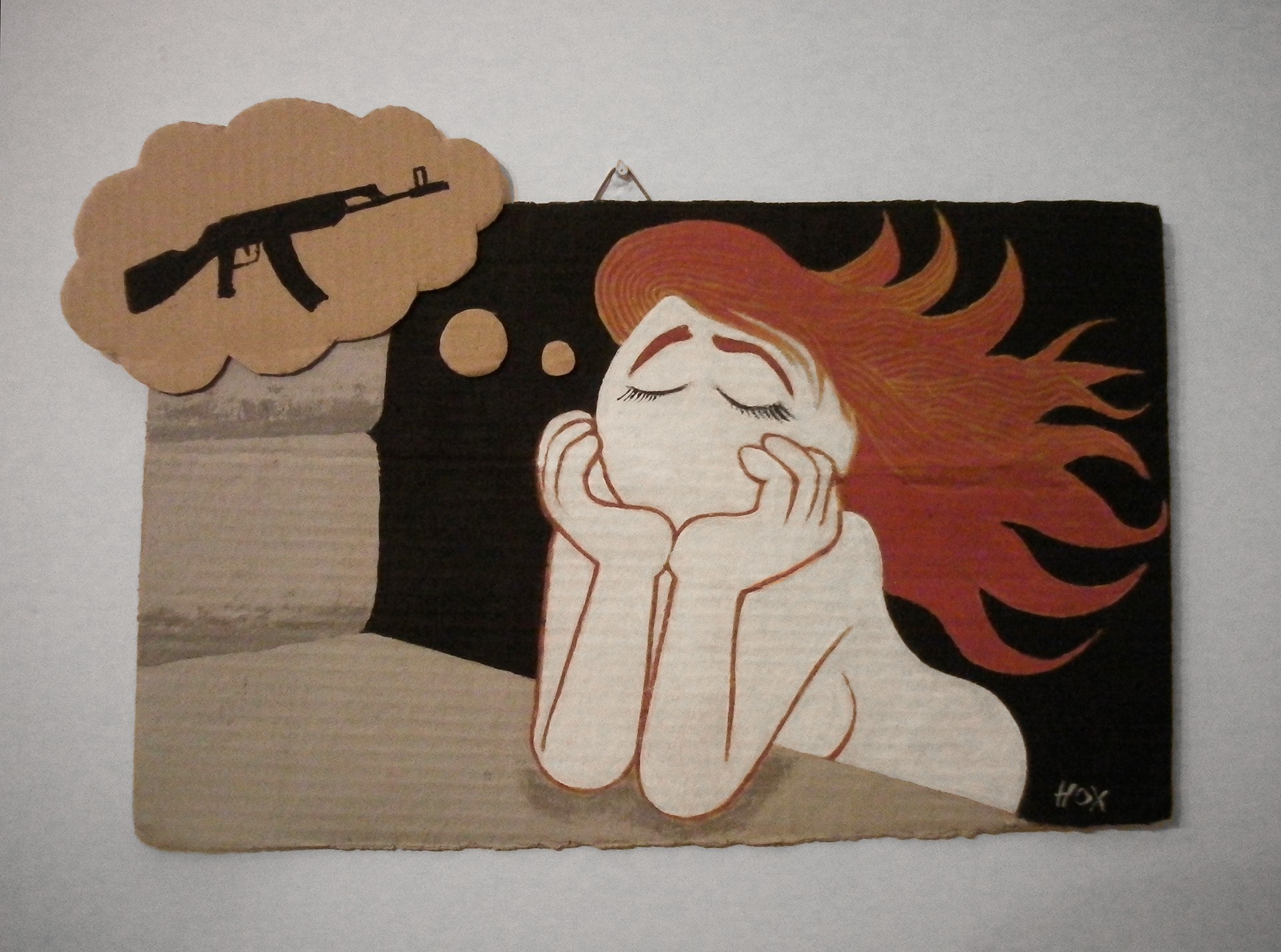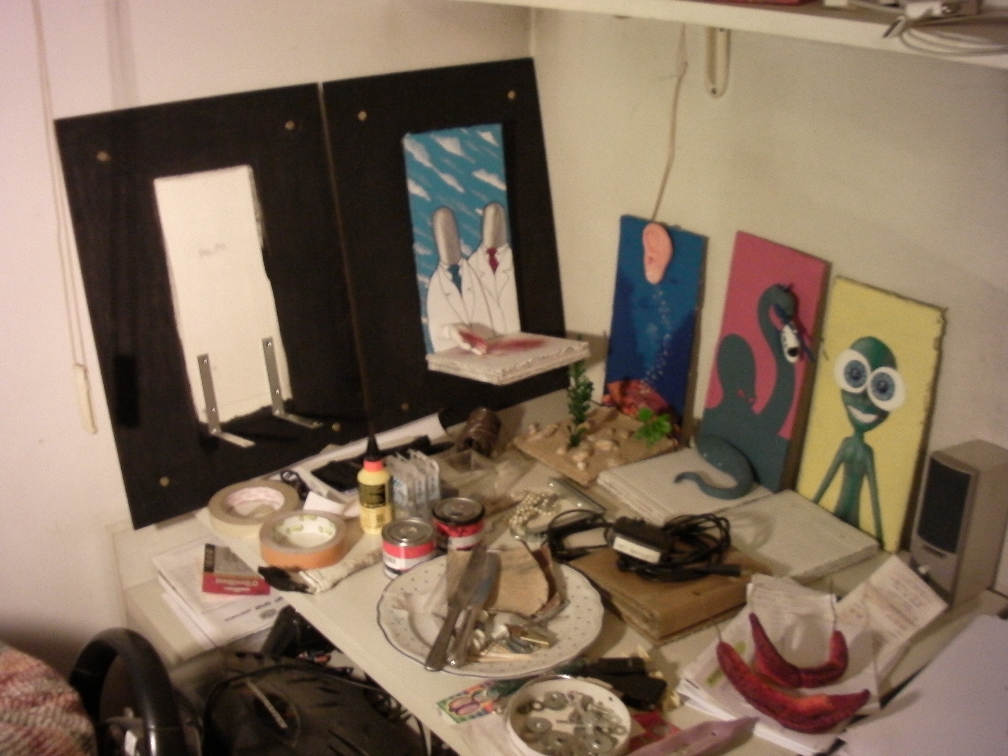 Painting / modeling First ear draft. Ear painted with acrylics. Screw and bolt to secure the ear to the frame. Preparing the skeleton. Modeling the claw around the metal skeleton. Claws ready. Close-up view of the left claw. Close-up view of the left claw. Drying up the claws under the sun. A first rough assemblage of parts. Crab claws painted. Almost finished, it only lacks a few little details. Hand in hand. Broken tentacle. Paintings/sculptures assembling area. I didn’t notice it at first, I was too busy drying up colors the faster I could. LOL – cm 30 x 30 Jazmin Loves Guns – cm 45,5 x 30,5 Joke – mm 24 x 37 Regret – cm 50 x 30 Free Fall – cm 21 x 30 Jerks on Speed – cm 30 x 21 Robot – cm 15 x 30 Ylenia – cm 15 x 16 The Hooker – cm 24 x 30 Oh No! – cm 30 x 30 The Run – cm 30 x 30 Progress – cm 30 x 30